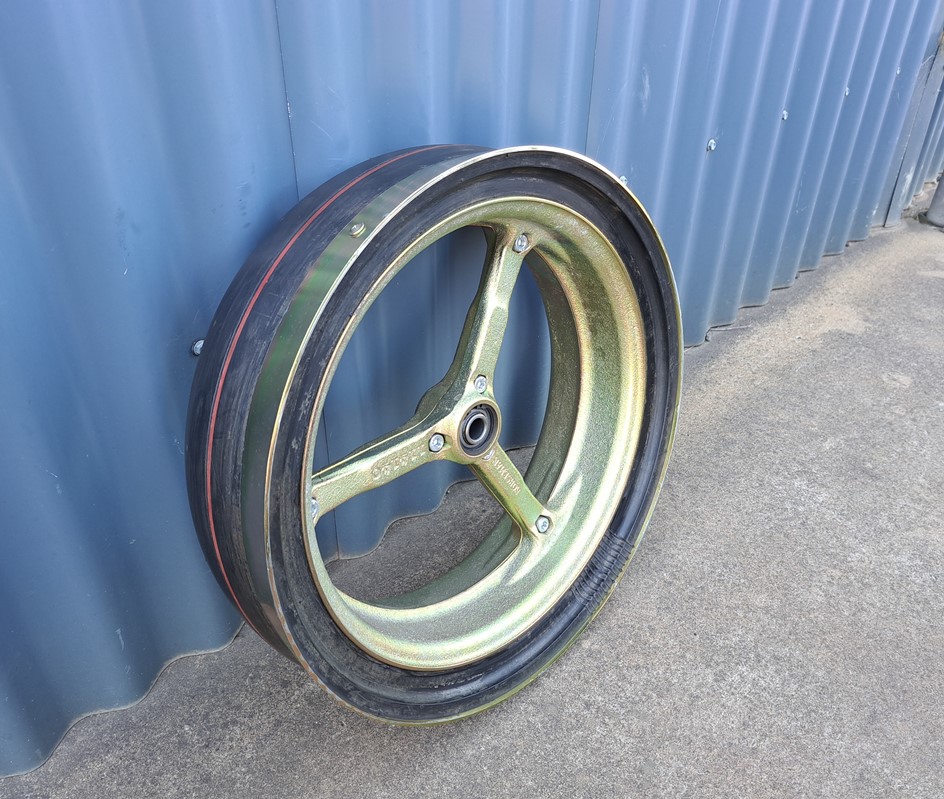 WHEEL DEPTH SPOKED COMPLETE W/- 40MM BEARING, D1086 TYRE & SCRAPER RING
